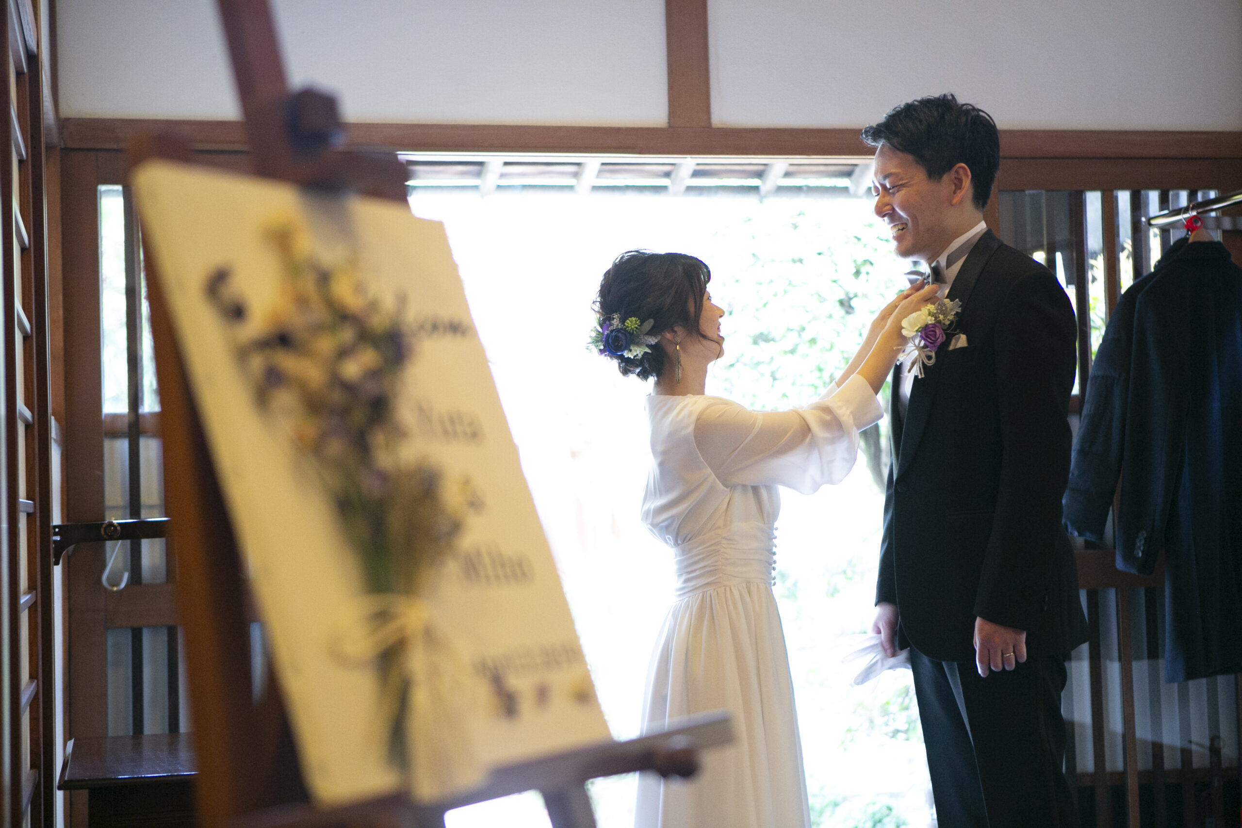 手を伸ばし、新郎様のネクタイを結ぶ新婦様。笑顔で答えながら、フワッとお姫様抱っこまで。沢山の仲睦まじいお姿を見せて下さいました♪