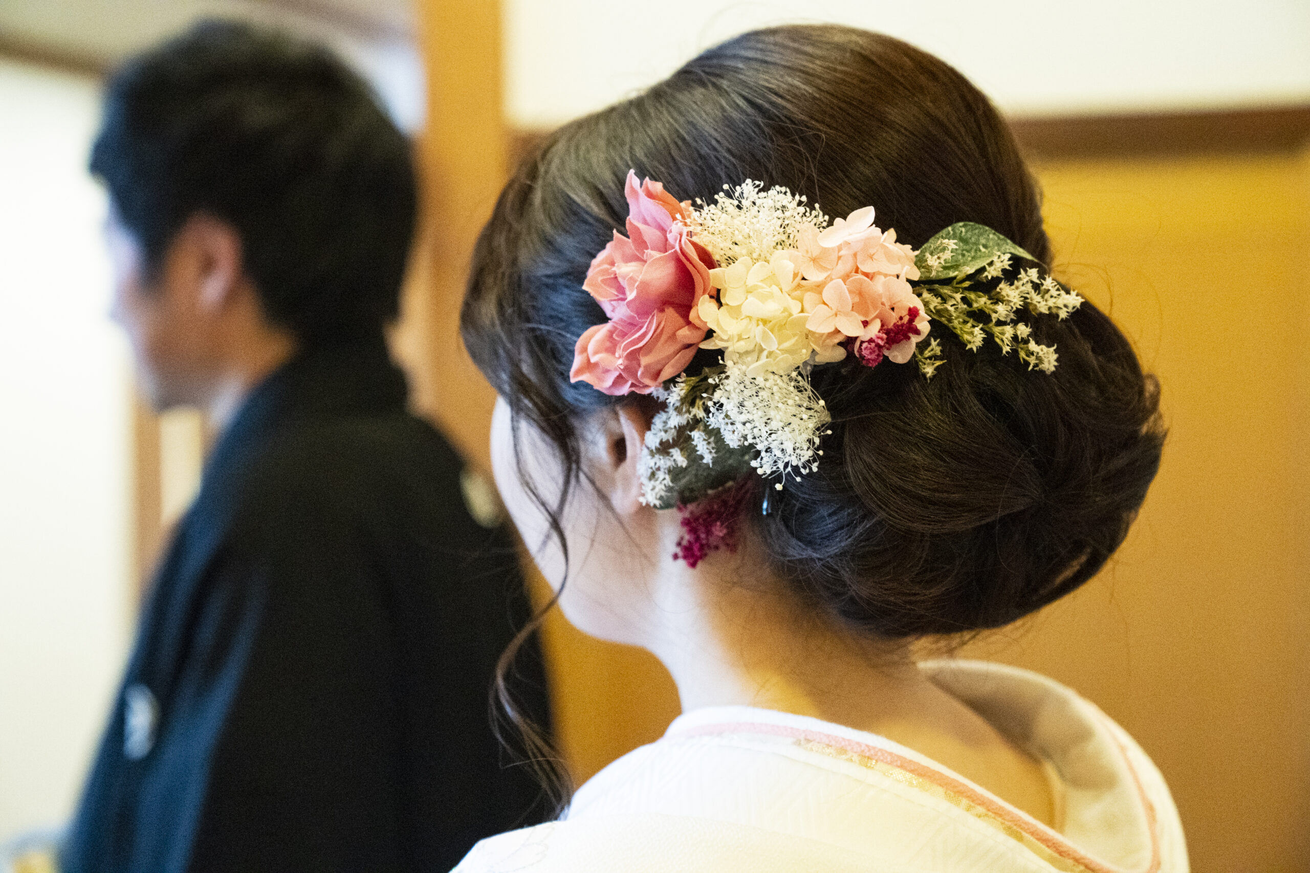 白に色彩を加える髪飾り。襟もとにも華やかなお色を。