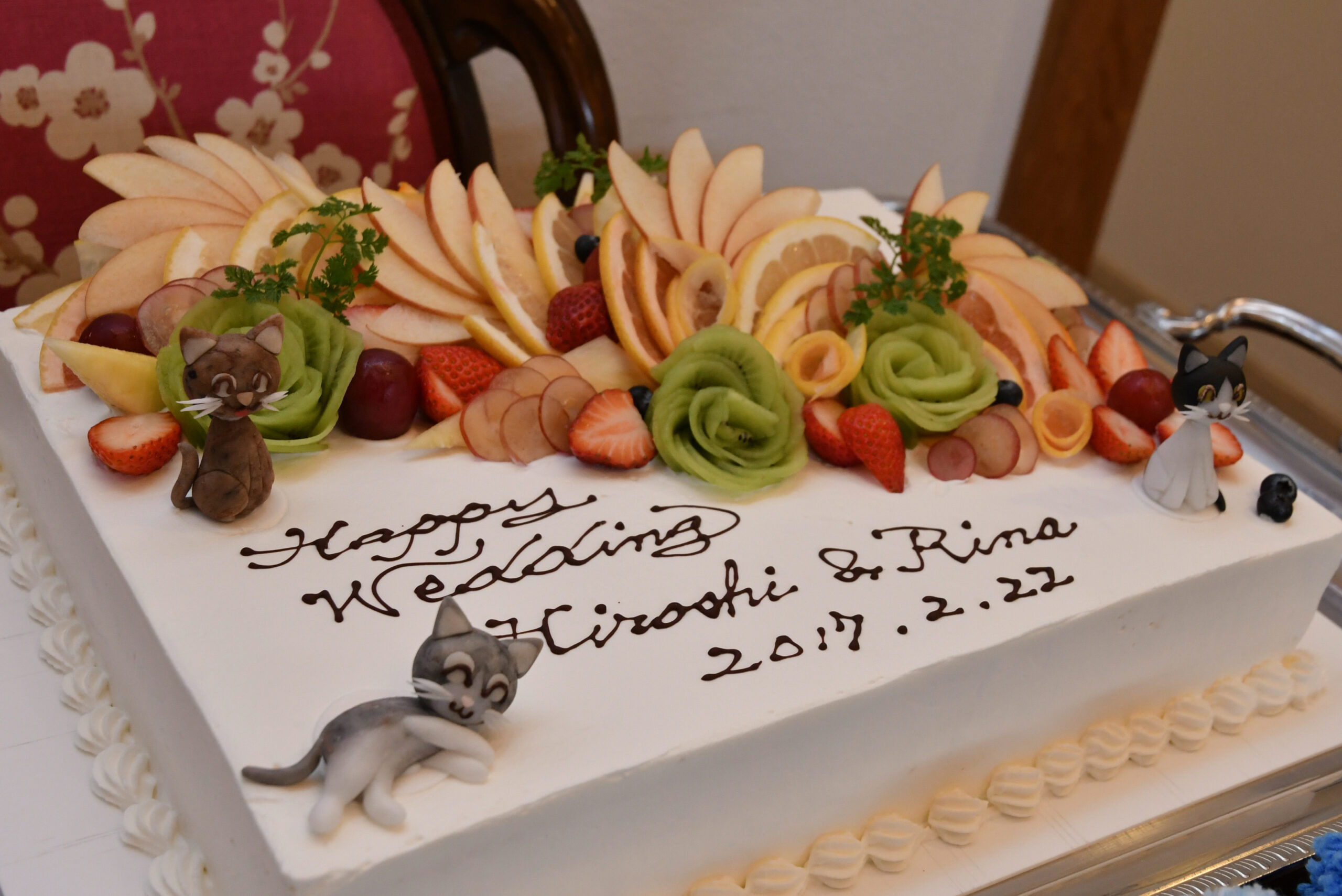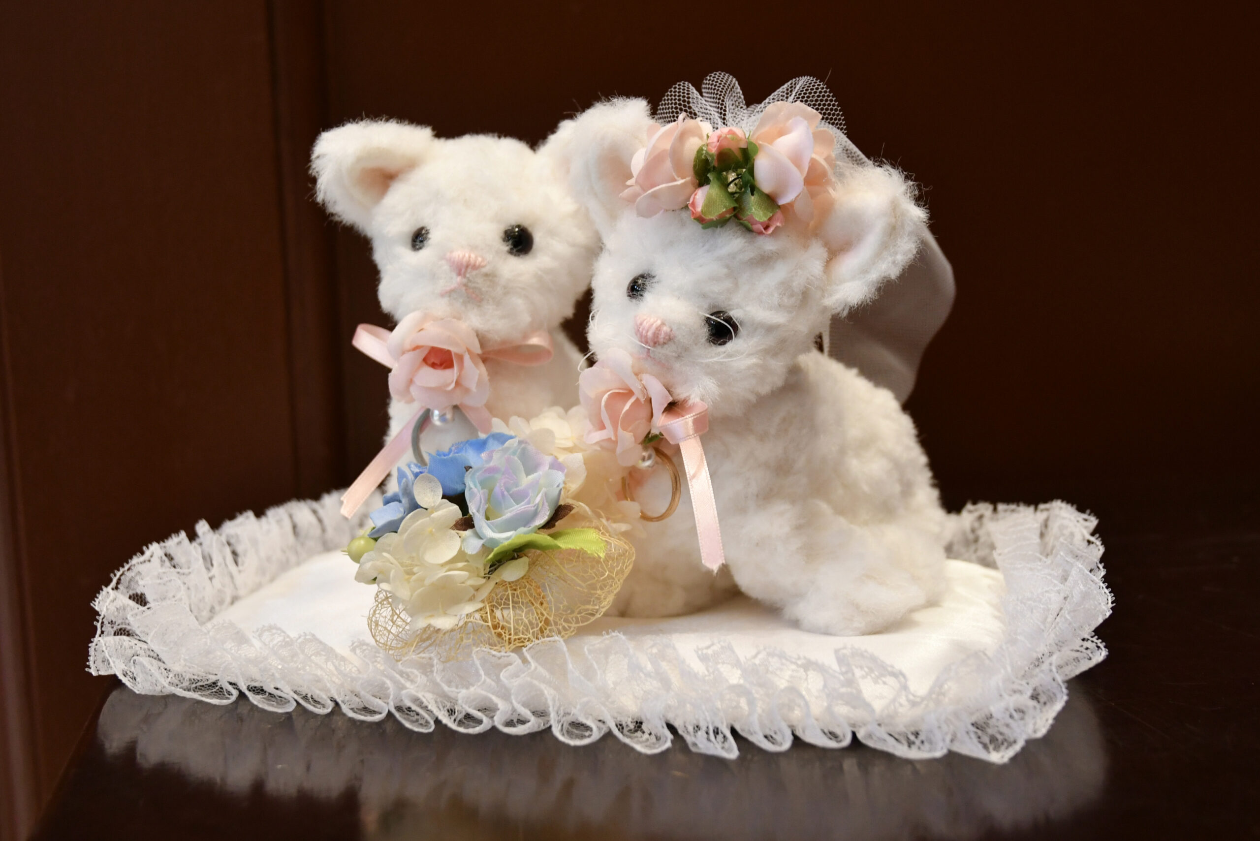 そしてお二人が飼っている、猫ちゃんをイメージしてお作りしたマジパンをケーキにおのせしたり、ご新郎お母様手作りのリングピローの猫ちゃんもゲストだけでなく、カメラマンもお写真を撮るのに夢中でした!