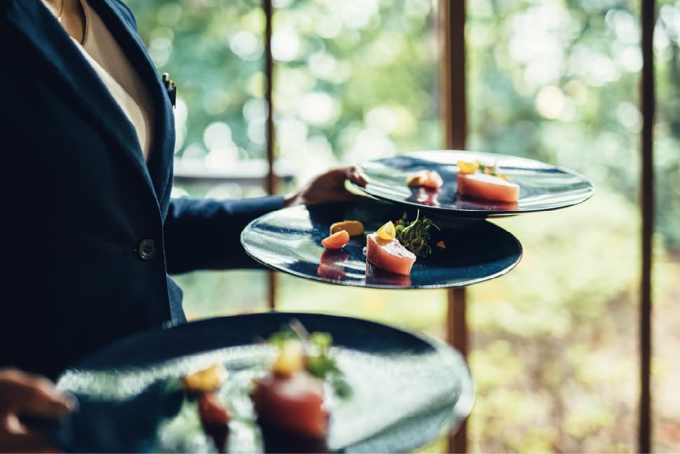 A variety of subtle, elegant cuisine is served both hot and cold. We are dedicated to offering exquisite appetizers and sumptuous desserts in a gentle manner to accompany the thoughts of the bride and groom and remain quietly in the hearts of the guests.